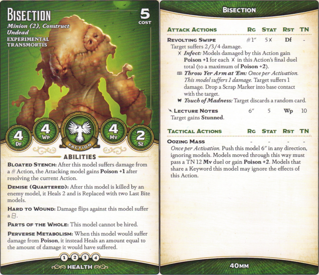 Let’s not bury the lede: the key mechanic here is Demise (Bisected). When your Leftovers dies, you get two 4-hp Bisections; each of those turns into two 2-hp Last Bites. The net result is twenty-four wounds for 8ss, a rate that’s really hard to beat, especially since Perverse Metabolism packs in some healing. But by the same token, if your opponent can cancel the demise – and anti-healing tech is the easiest way to do so, though be careful of that “enemy model” rider in the face of Obeys – then you are definitely overpaying.