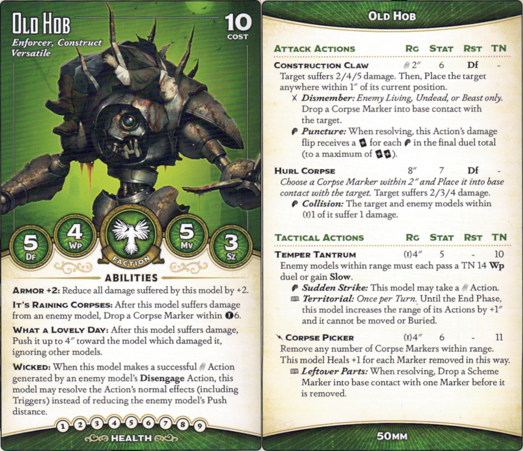 That said, a 2/4/5 damage track isn't that inspiring for a ten-stone beater, and the triggers here are just so/so (although Dismember is better on Hob than on many other models who have it). Hurl Corpse is pretty appealing, especially at Stat 7 - sure, the damage isn't