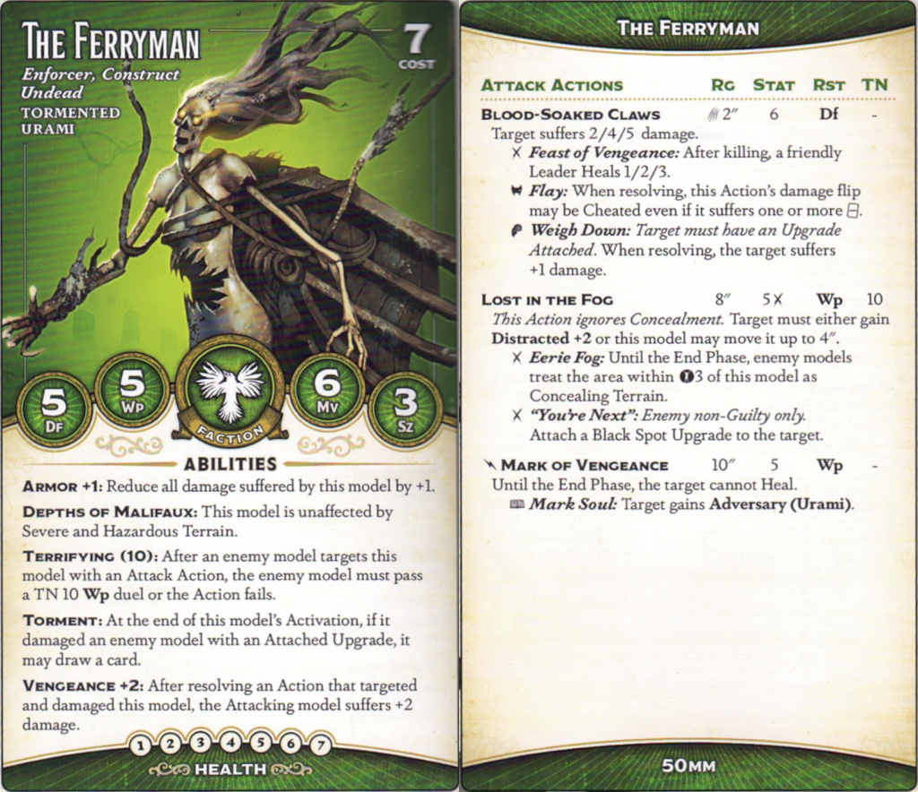 not Incorporeal, though it does have armor and Terrifying to keep it alive (and Depths of Malifaux does a good Incorporeal impression, at least when it comes to terrain). Otherwise, it has a very Urami looking card, with Mark of Vengeance and a reasonable but not earth-shattering attack. The 2" engage is actually very nice, especially with Mv 6 - this thing is surprisingly speedy. I also