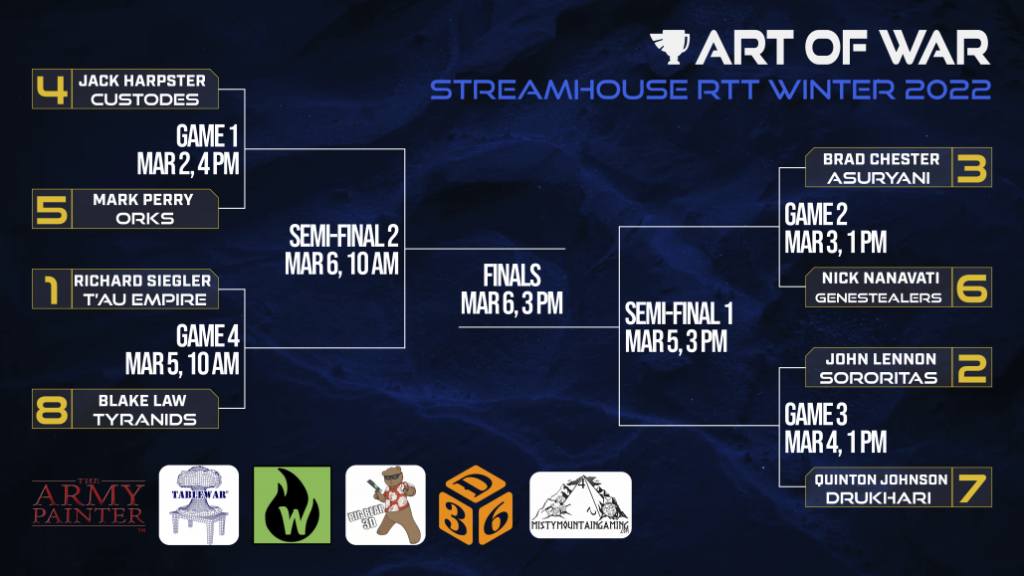 The Streamhouse RTT is a three-round, 8-player event taking place at the Art of War house between March 2nd and March 6th, with each player taking a different list representing one of the game's top factions. Here's the lineup: