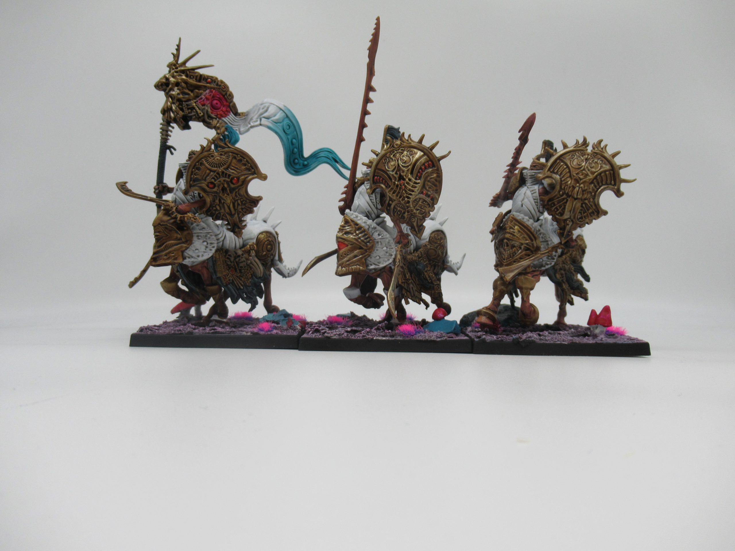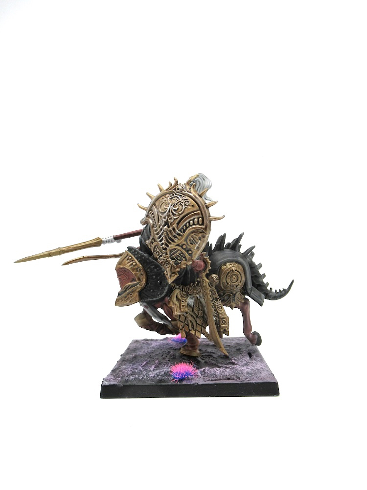 The Centaur Avatara are beautiful sculpts. Elfin and alien, nightmares not because of raw flesh-melting biohorror but because their biohorror is so flawlessly elegant. The long, twisted fleshy lance arm stands out as a highlight in that regard; there's no clear transition point where the texture changes or the flesh tears to reveal the bone underneath. The barding is made of beautiful metallic diamond patterns, heavy with gold and jewels, woven with skulls and bones. In some ways I compare this kind of glorious gilded monstrosity to Warhammer's Chaos Warriors, but Chaos Warriors have always had a ragged, scrappy, torn, barbaric edge to them that has never felt right to me when set against their golden trim. The Centaur Avatara feel like the kings and queens of faerieland, mutated as a fashion statement and not as a mistake.