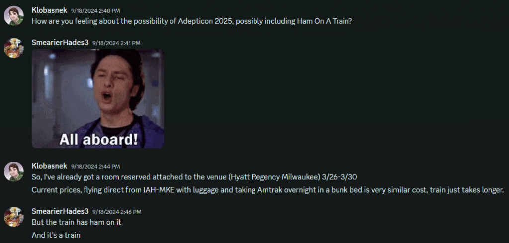 Andrew “Hero of Team Imperium” Corban: Adepticon was an event that had been on my To-Do list for a long time, so when Greg suggested a trip AND a train ride I was sold immediately. Like many nerds I was raised as a Train Guy by my father, and his father before him, but have never taken a train trip more than an hour or two before so I was pumped to give an overnight trip a try. Then he told me about the possibility of Ham Train on top of that and I was Doug Doublesold.
