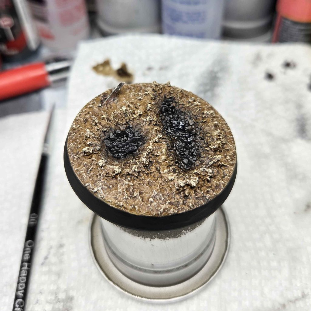 Basing was done with a variety of pastes. The name of the game was building up the impact craters with successive layers. The results were primed black and basecoated with AP Air Leather brown, washed with Aggaros Dunes Contrast, and drybrushed with Zandri Dust and Morghast Bone. The darker bits in the crater were stippled with black paint and blended in with some successive layers of Nuln Oil and Army Painter Soft tone.