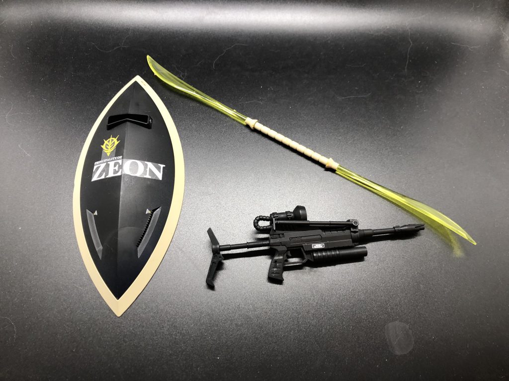 So, the actual model. There aren’t a lot of accessories, but they are nice, at least. The gun itself is a very cool design, it looks modern and practical. There’s a clear part for the sight and, it can be accessorized with a bipod and a grenade launcher. The effects parts for the sword are interesting, making more of a beam naginata out of it, though parts are provided for a huge double-sided beam saber if you prefer. The shield is nice enough on its own, but the real power move here is that it comes on a big articulated arm which is - barely - flexible enough for the arm to reach back and grab it off the backpack. It holds on by wrapping the fingers around the handle, and it clips on to the back of the hand, which would probably be enough if the thing weren’t so heavy.