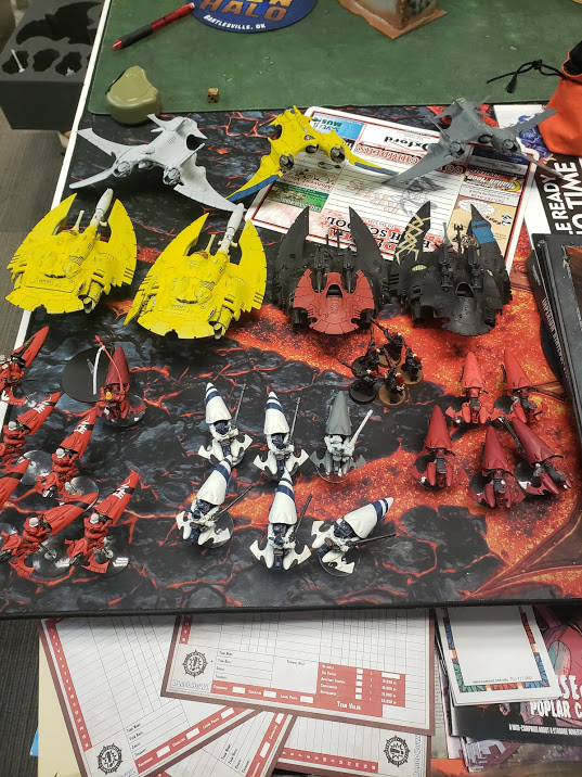 He deployed everything he had in his top NW corner, just his planes visible to my Speeders, as planned. He started his Shining Spears and Autarch off the table and rolled to seize. He didn't. The first turn and victory were sure to be mine.