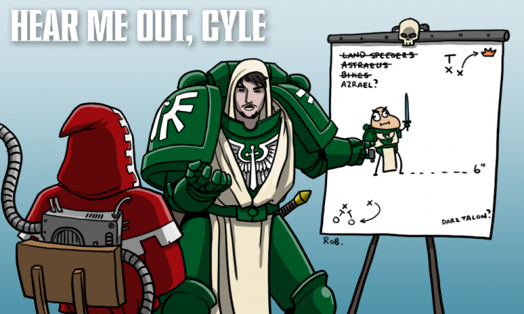 ++++++Land Speeders. It isn’t 5th edition anymore Chase and you aren’t playing Space Wolves. 490 points for 30 wounds with 10 krak missiles isn’t terrible. However they don’t get to ignore heavy modifiers, and do not have a real Chapter Master to get over the negative modifiers because you are still in Dark Angels. You are also spending a pile of points on a great model in the Talonmaster, but are using it to babysit backline units where his real strengths of having 18 shots and a power sword on a character platform aren’t being used.++++++