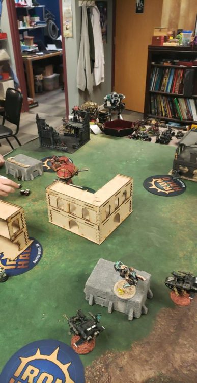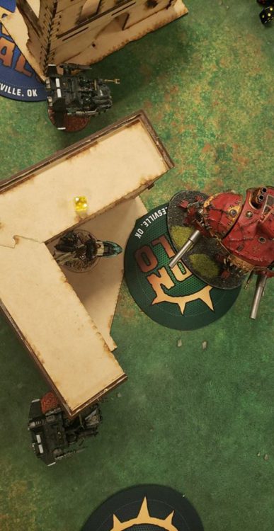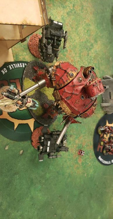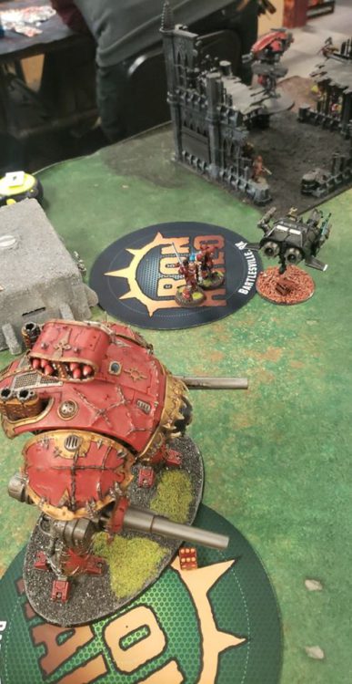 This was it. There were four models left on my side of the table. He had only his unblemished Battle Cannon Chaos Knight, 5 Chaos Space Marines on his middle Objective and 7 Cultists hiding in his left-hand ruin.