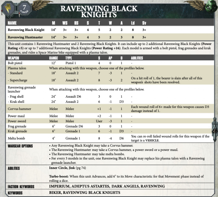 Okay, so before Chapter Approved came out this list would not have been possible. The Black Knights, Vengeance, and the Ravenwing characters points have all dropped so much it'd be an insult to them not to at least give them a shot. Not only that, Cyle but gaze your laser eyes upon the Land Speeder Vengeance at a -powerful- 100 pts. The whole idea of this list is to be able to take those savings Chapter Approved provided and apply it to make my list much more powerful. By using the Ravenwing Attack Squadron, I can make use of all these extra command points and invest in the hit and run tactics for my Black Knights. Being able to use Target Priority along with the Signal the Attack Stratagem, I can buff the Talonmasters as well as the Black Knights. That allows my Plasma to hit on 2s and not get hot. Not only that but with all the scouts, I can use the bullet hoses that are the HQs and the Spells provided by having both casters to provide all kinds of pressure. Opening thoughts?