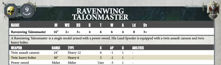 Ravenwing Talonmaster [9 PL, 188pts] Land Speeder: Twin assault cannon, Twin heavy bolter Talonmaster: Heavenfall Sword