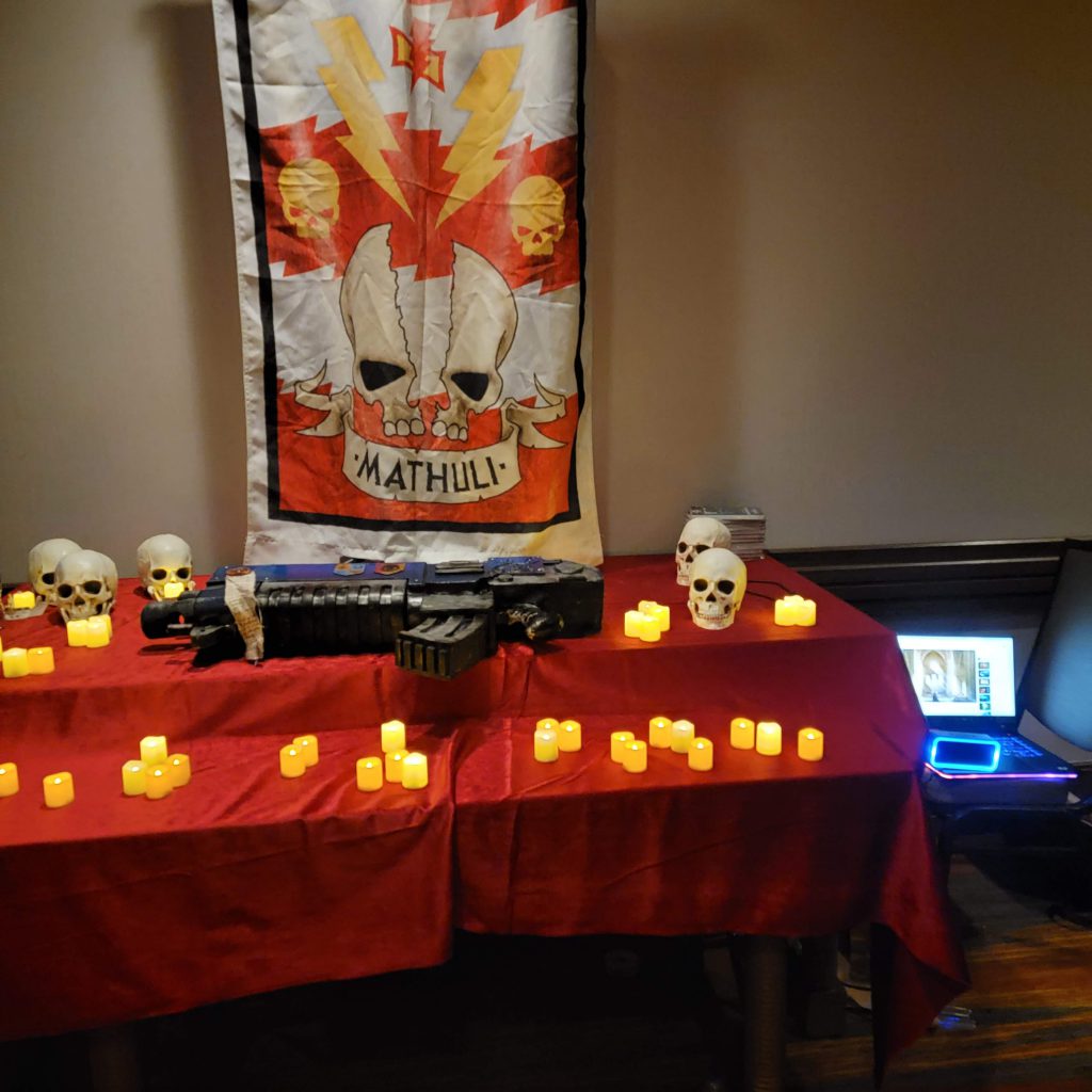 The Junta was a group of people who I had little time to get to know before the event, even though we shared a discord server. Some discord groups were very, very familiar with each other, and were able to jump right into the feelings of teamwork and narrative immediately, whereas others, like mine, were a bit slower going as time went on. All of that felt immaterial as I stood in this church with my team, who had no idea who I was at the time as they had all had a chance to meet each other prior. Immediately, A person who went by the name of Neophyte Ganesan began to assign our group to tables to battle The Imperium who was also in that room by name of the army.