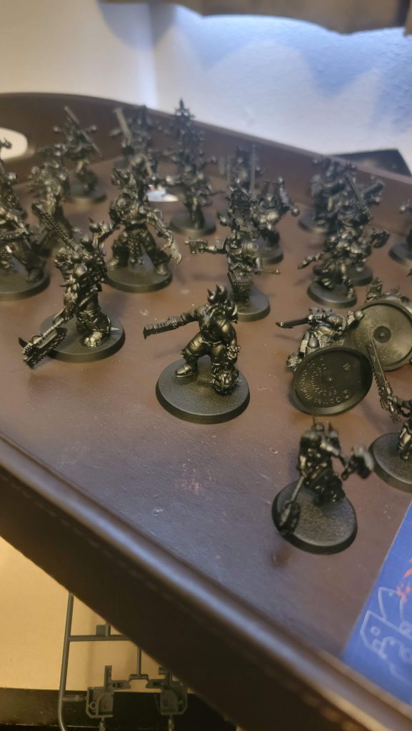 I wish I could lie to you and tell you that I was solely focused on completing this job, But because there was just so much to do alongside my school work, it felt like this process would never end. I had to find creative ways to distract myself from the tedious task of never-ending gold. I never truly respected how much trim was on these new corn berserker models, and do not get me wrong when I say that they are lovely sculpts. Games Workshop did a fantastic job on these new models; empowered by their chosen God, they are as tall as Primaris Space Marines.