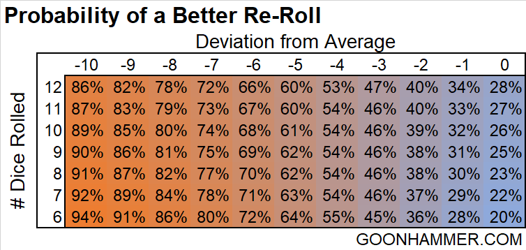 From there we can look at the chart below to see the probability that a re-roll will be better. To make this chart I compared the result of the original die roll to the mean and standard deviation of the distribution for one fewer die roll. From our previous example, -2 translates to a sum of 40. The probability that a result of 11 dice will sum up to 40 or better is 40%, which is the value seen in the chart. In other words for the distribution rolled you have a better than average chance of averaging less on the re-roll.