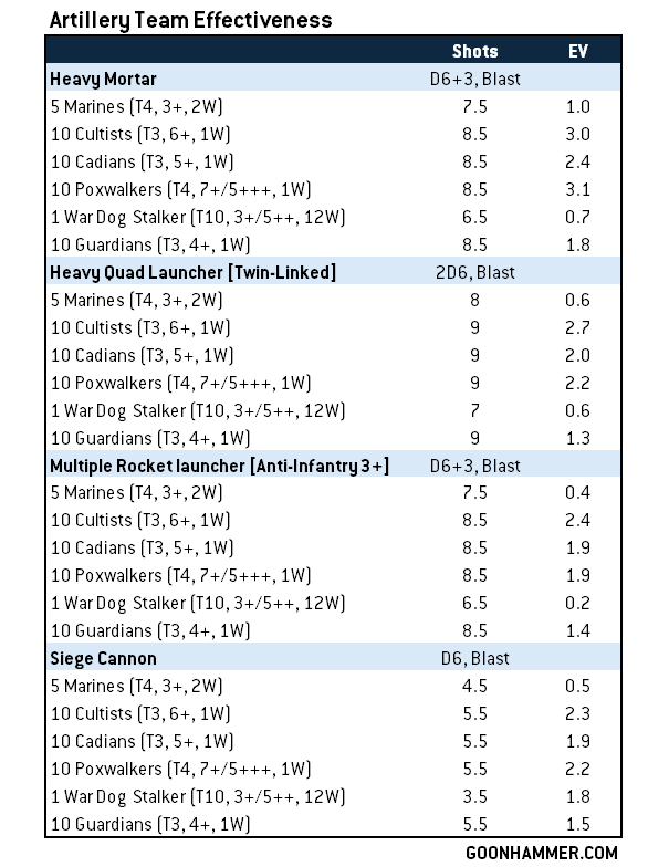 The value here varies by threat, to be certain, with the big determinant being whether your targets have 2+ wounds or just a single wound. The Heavy Mortar tends to have the best overall performance of the bunch, owing to a solid shot count, S8 AP-1, and 2 damage, while the Siege Cannon gives you the best results if you're trying to crack a War Dog (S12, AP-2, 3 damage) - but those aren't particularly reliable. The Heavy Quad Launcher tends to punch above its expectation due to having twin-linked but ultimately you'll get the best results from just going heavy mortars.