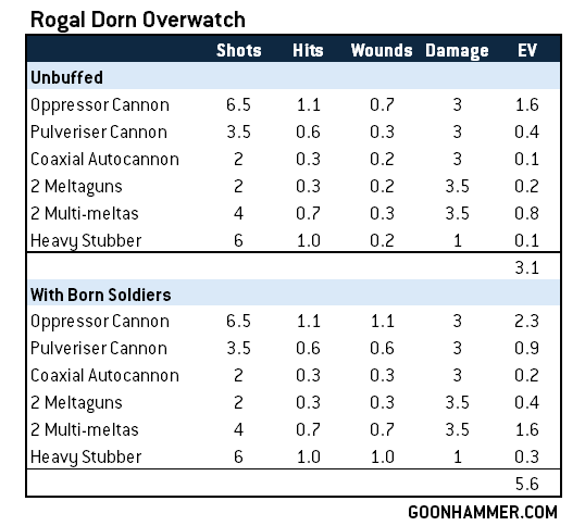 Against a Rhino that hasn't moved into Melta range, you're looking at nearly doubling your output, and if your target is in Melta range, you can expect something more like 7 damage on average with your shots. There's a ton of value here in removing the wound roll from the process, particularly for the melta guns that only wound on a 4+ against T9 targets. Against harder targets your expected value without Born Soldiers drops to 2.6 expected wounds. Of course, against weaker targets your odds are better - against a T4 target you're likely to be hitting 4.6 wounds per volley. That's pretty solid if you just need to overwatch a solo character off the board, making moving around dorns a dicey prospect.