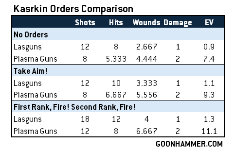 Orders are the bread and butter of the Astra Militarum but there are two effects that have an impact on your ranged output. Take Aim! Improves the Ballistic Skill of your unit by 1, while First Rank, Fire! Second, Rank Fire! (FRFSRF) increases the attacks of your rapid fire weapons by 1. Given that a unit can typically only be affected by one at a time, how do these compare to each other when applied to a unit of Kasrkin? I ran the numbers for six lasguns and four overcharged plasma guns, shooting at MEQ targets.