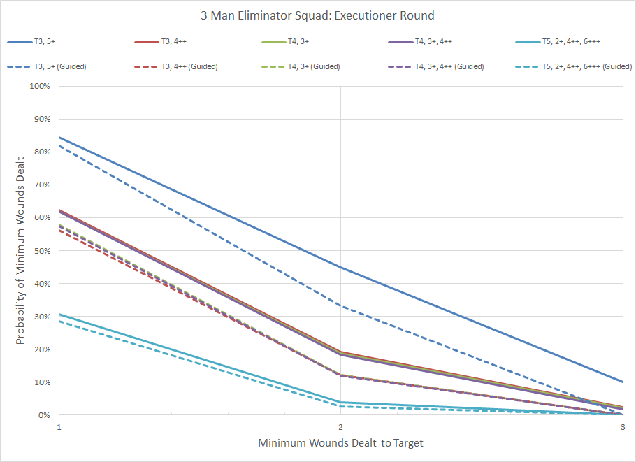 The low damage limit the utility of the Executioner Rounds to threats that cannot otherwise be targeted, perhaps as a means of finishing off a target that was wounded elsewhere. Due to the low number of shots and the +2 to hit benefit already associated with the Executioner rounds it is detrimental to use the Guided Aim ability; you're better off with a higher volume of fire.
