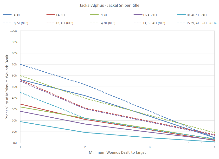 Distribution of minimum wounds for a Genestealer Cultist Jackal Alphus, including the Gift From Beyond relic. The results from a Sanctus are slightly worse since the Sanctus is firing at AP -1 instead of -2.