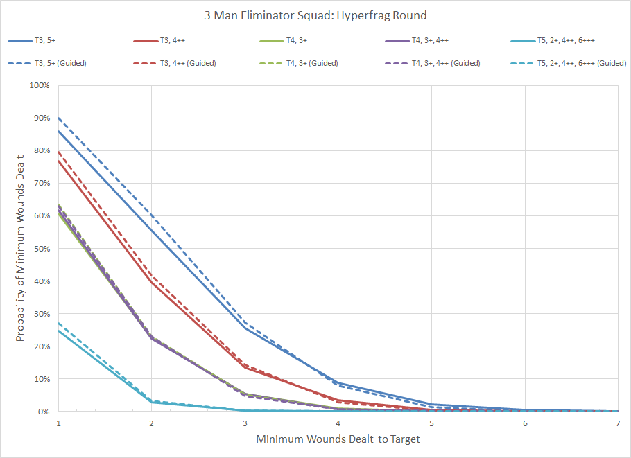 The Hyperfrag rounds offer the ability to deal more wounds due to the increased number of shots; on average a 3 man squad will get 6 attacks. In this scenario the increased wound and hit benefits offset the loss of a single shot; this may not necessarily be the case for