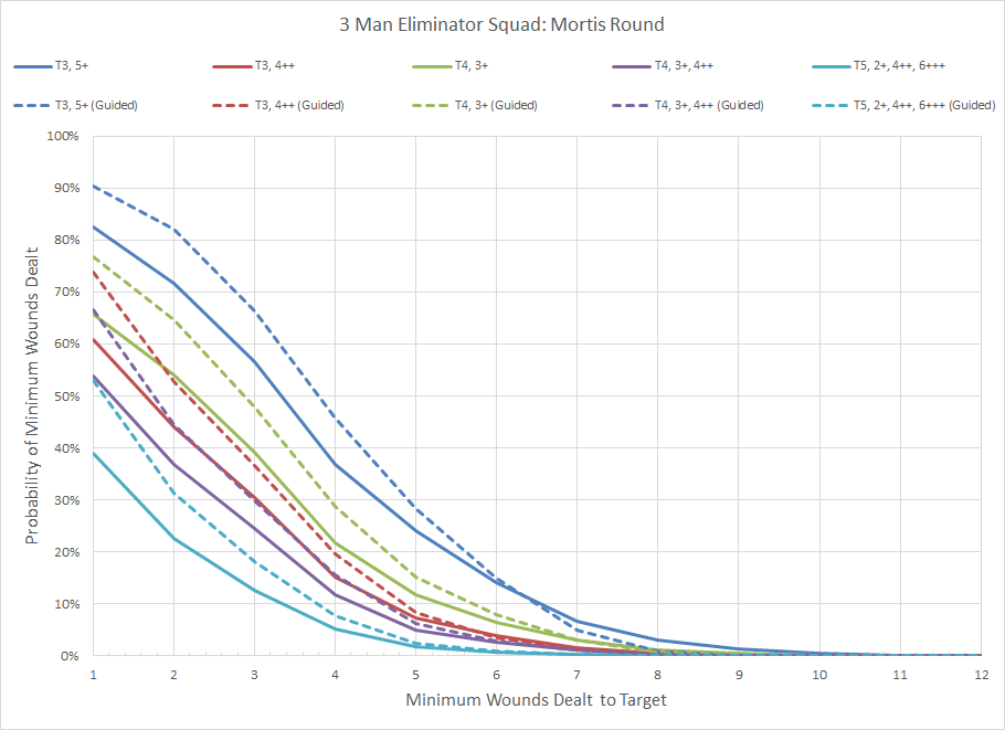 The Mortis rounds are the ideal solution for taking out a visible threat due to the combination of high AP, 1d3 damage characteristic, and the ability to deal mortal wounds on a 6+. Of all the options they benefit the most from the Guided Aim ability as it doubles the chances of the attack dealing a mortal wound.