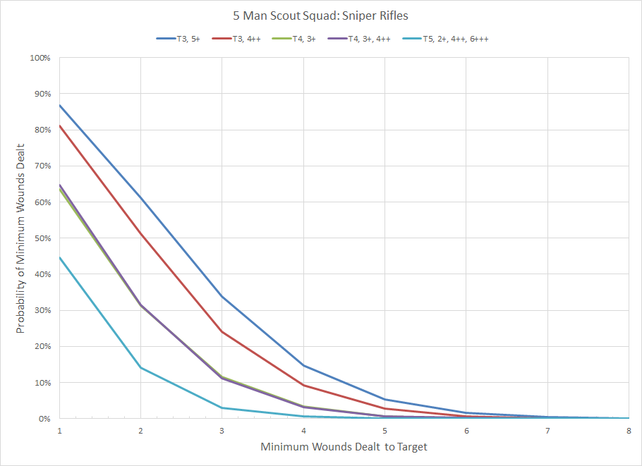 Distribution of minimum wounds for a Space Marine Scout Squad armed with 5 Sniper Rifles. This profile is identical for Eldar Rangers, Astra Militarum Ratling Snipers, and Necron Deathmarks outside of their 12" Rapid Fire range.