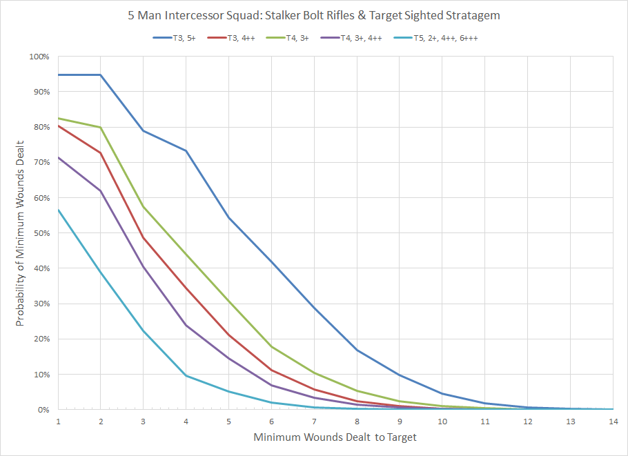Distribution of minimum wounds for a 5 man Space Marine Intercessor Squad armed with Stalker Bolt Rifles and using the Target Sighted Stratagem.