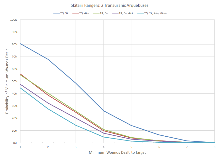 Distribution of minimum wounds for a Skitarii Ranger Squad armed with a pair of Transuranic Arquebuses.
