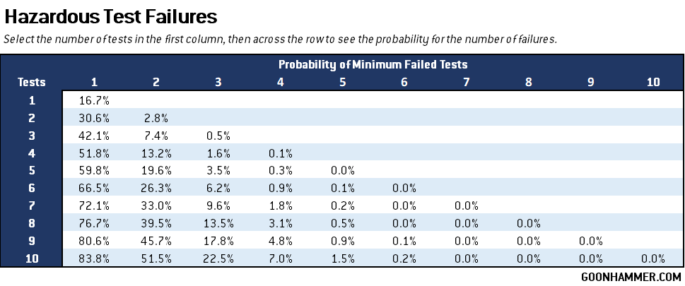 binomial probability. For those who don't obsessively read this column, binomial probability is the chance that a given number of successes will occur for a set number of trials assuming a set probability of success. Cumulative binomial probability allows us to establish that probability that up to a given number of successes will occur. Subtract that from unity and you get the probability that more than a target number of successes will occur. Rather than do math, you can consult the helpful chart below.