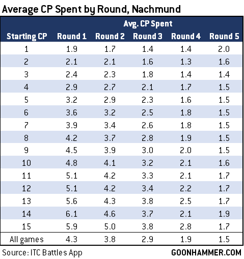 This brings us to an additional question: We speculated in our review that abilities that only refund or generate CP for you when stratagems are used will become worse in this new ruleset. But what will that actually look like? Let's look at CP spending by round in Nachmund: