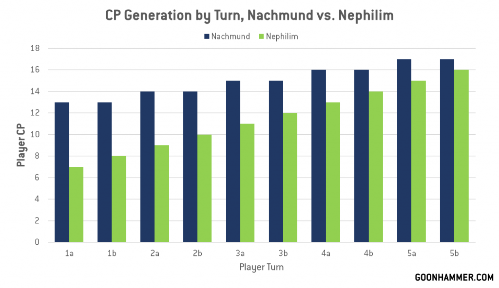 each turn's Command phase, giving them 2 per battle round instead of 1. In practice, this means a standard player will generate 16 CP over the course of a Nephilim game (6+10) instead of 17 in a Nachmund game (12+5).
