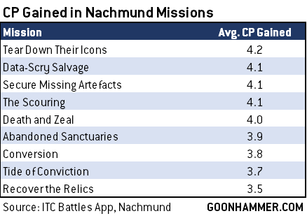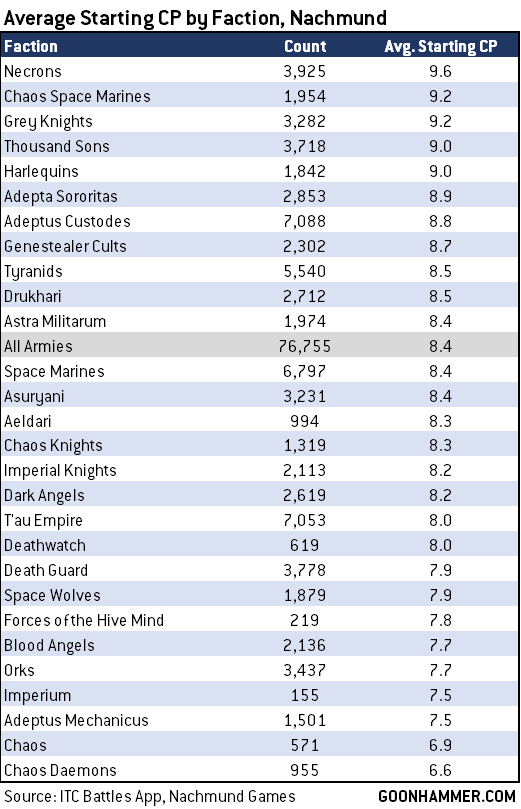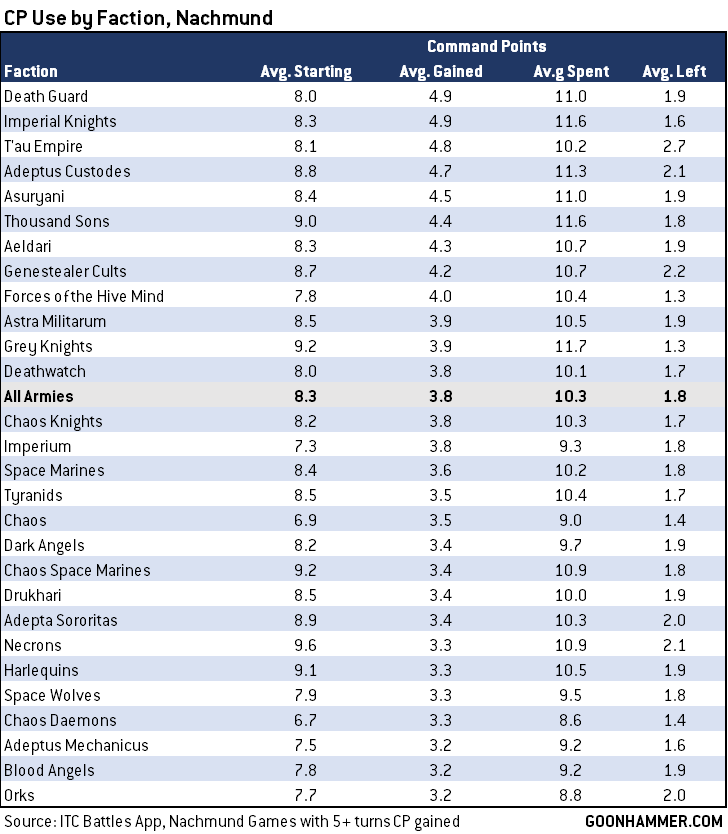 Players gained an average of 3.9 CP per game in Nachmund, including the battle-forged CP they gained for their turns; if this seems lower than expected consider both the number of games that end before turn 5 and that there are three missions in which conditions can prevent a player from gaining their Battle-forged CP bonus. The kings of extra CP here are the Death Guard, who can bring the Tallyman to the table, and Imperial Knights, who can generate extra CP just by existing via a Code Chivalric.
