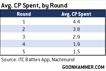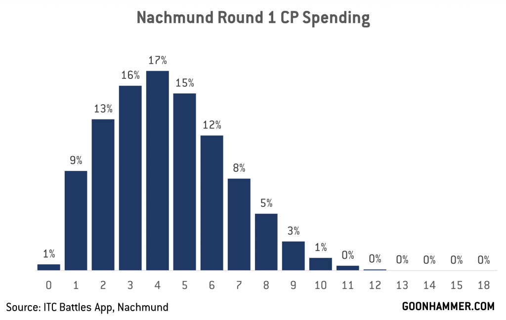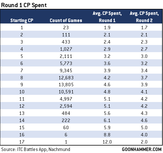 This sheds a bit more light on things - the average is 4.4 on round 1, but there's a fairly large spread here between 1 and 7, though nearly half of players spend 3-5 CP in the first battle round.