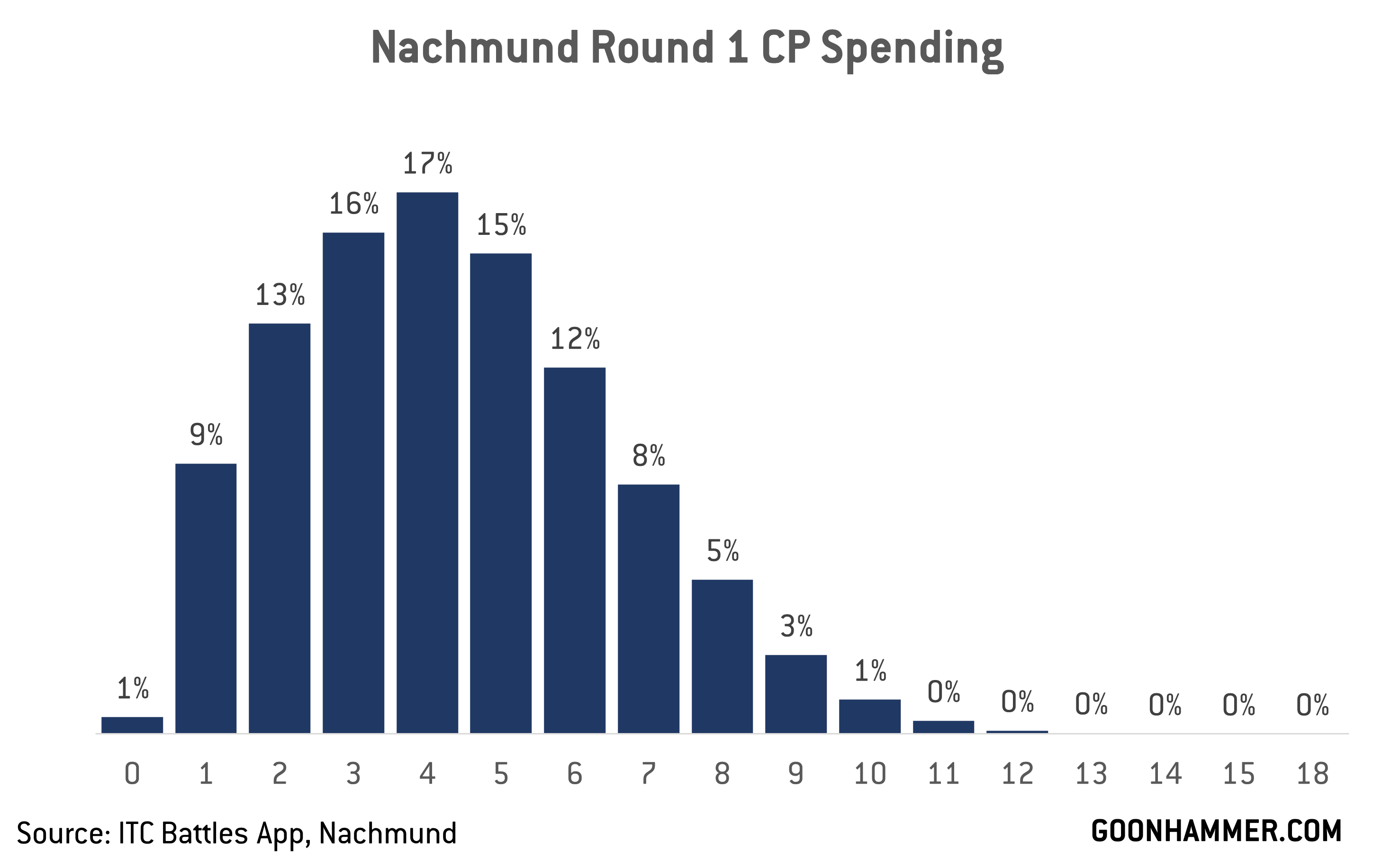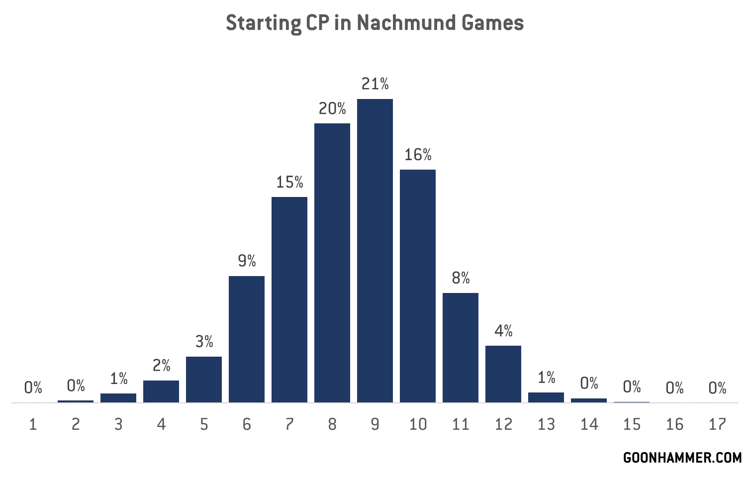 ITC Battles App, the premier game tracking and management tool for Warhammer 40,00. Using data from more than 64,000 games played with Nachmund missions, we can see that, on average, players in Nachmund started with 8.5 CP, and 72% of recorded lists started with between 7 and 10 CP, while 58% started with 8-10.