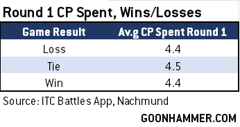 There's no correlation or observable difference, either in aggregate or for factions, between round 1 CP spending and winning - you don't win the game by blowing all your CP in the first round, nor are you rewarded for keeping it all for later.