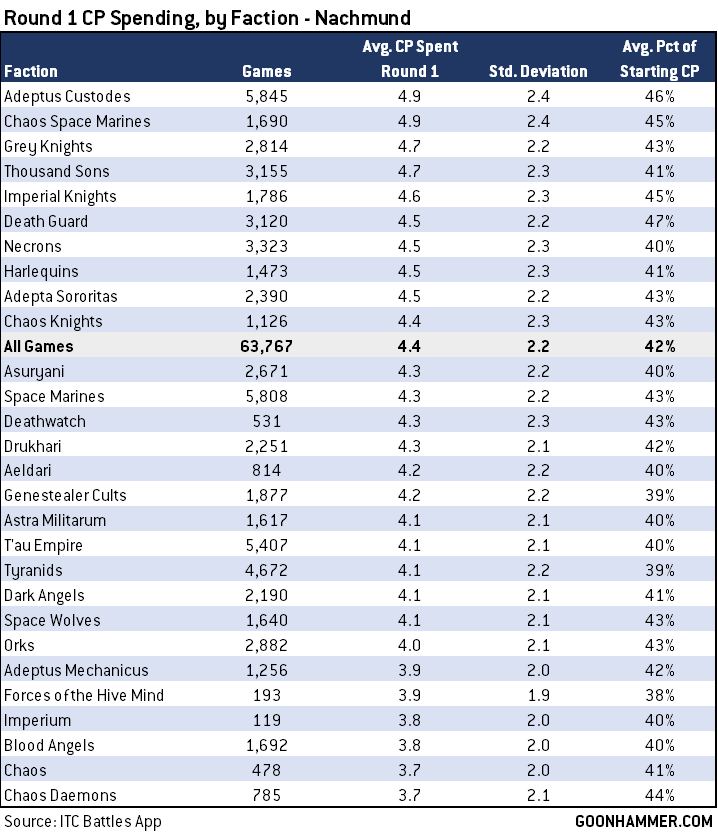 By faction, we can see that the Death Guard, Adeptus Custodes, Chaos Space Marines, Grey Knights, Thousand Sons, Imperial Knights, and Death Guard are the biggest round 1 CP spenders, and on average they'll spend 44-50% of their available CP round 1 on effects. For the first three factions, this is because as we'll see, they're among the game's best at generating additional CP. For Chaos Space Marines, they typically have more to spend due to an ancient Codex, as well as being a CP-thirsty army. As a Thousand Sons player, I definitely feel that 4.7 number, and I frequently end up on the bad end of that +/- 2.3 standard deviation.