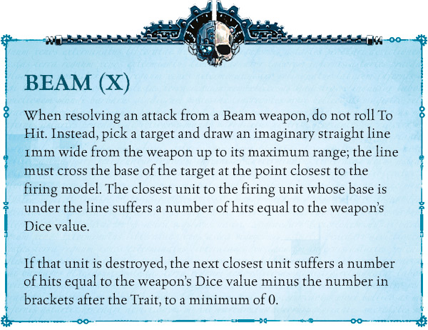Beam trait even though volkite weapons are supposed to be heat rays. Outside of it looking cool there's no reason to take it, especially since both the Reaver and the Warhound can slot a vulcan mega-bolter in the same location.