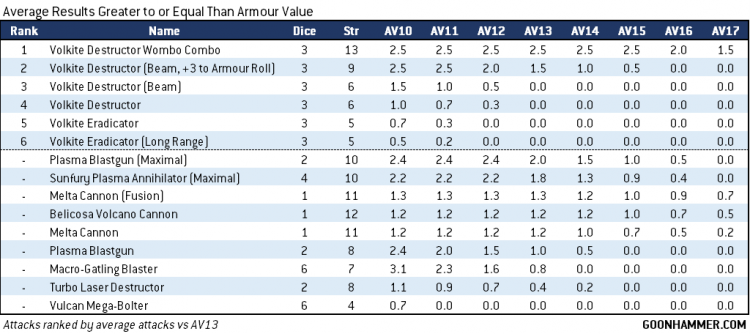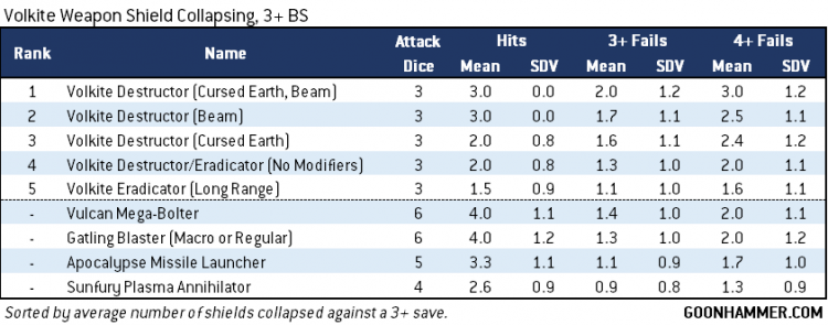Cursed Earth Stratagem) and compares them to a selection of alternative choices which a player may wish to use. From a shield stripping perspective the unmodified volkite weapons are reasonably good, averaging between an carapace apocalypse missile launcher and a gatling blaster depending on the target value on the hit roll. Where things fall short is against the direct competition of vulcan mega-bolter. The mega-bolter has the same range, no hit penalties, and averages more stripped shields even though it's half the cost in points thanks to the