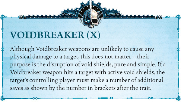 Voidbreaker (2) ability isn't worth the extra 10 points given that the weapon is no better against armour than the vulcan mega-bolter, the range penalty is terrible, and it inexplicably lacks a