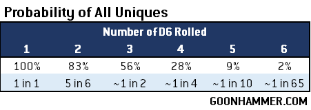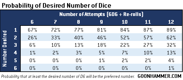 To figure out the probability that you'll get the desired number of extra re-rolls, you can use the chart below. Up to 3 dice will get you extra re-rolls the majority of the time, but things get precarious from there. The probability of getting 5 unique values on 5 dice is roughly the same as an Aeldari player not getting the roll they want even with 6 re-rolls. Fate is fickle like that.