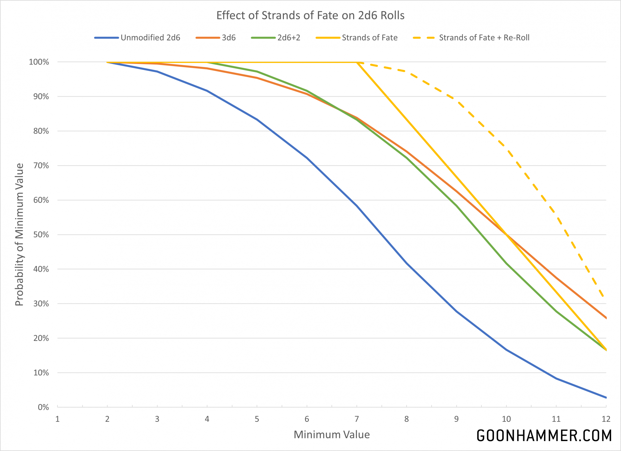 For the single D6 roll the result is pretty simple; you automatically get an unmodified 6. For 2D6 rolls the floor becomes 7 instead of 2, making it extremely useful for critical tests or charges from deep strike. From the chart above we see that Strands of Fate immediately makes the roll more reliable than even 3d6 for less than 10, and with a re-roll incorporated it is simply the most reliable mechanic in the game.