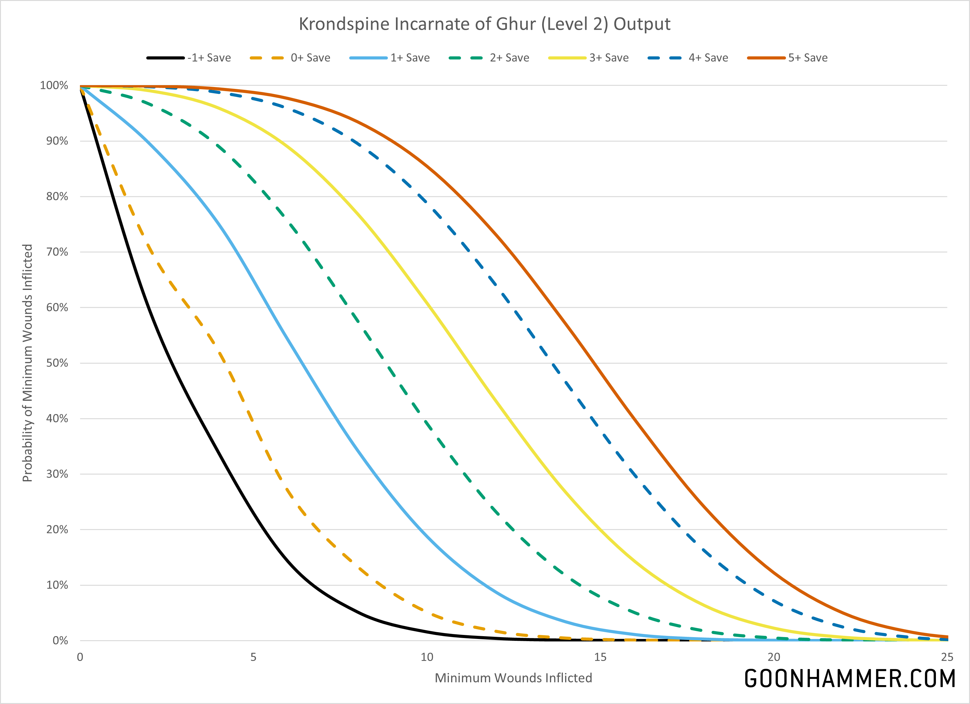 In terms of lethal output the incarnate has two sets of attacks. The first is a base of 6 attacks with a 3+ to hit, 3+ to wound, -2 Rend, and 2 Damage. The second is a base of 1 attack with a 3+ to hit, 2+ to wound, -3 Rend, and 4 Damage. The chart below shows the output against various Save characteristics for a level 2 incarnate assuming both attacks are directed against the same target.