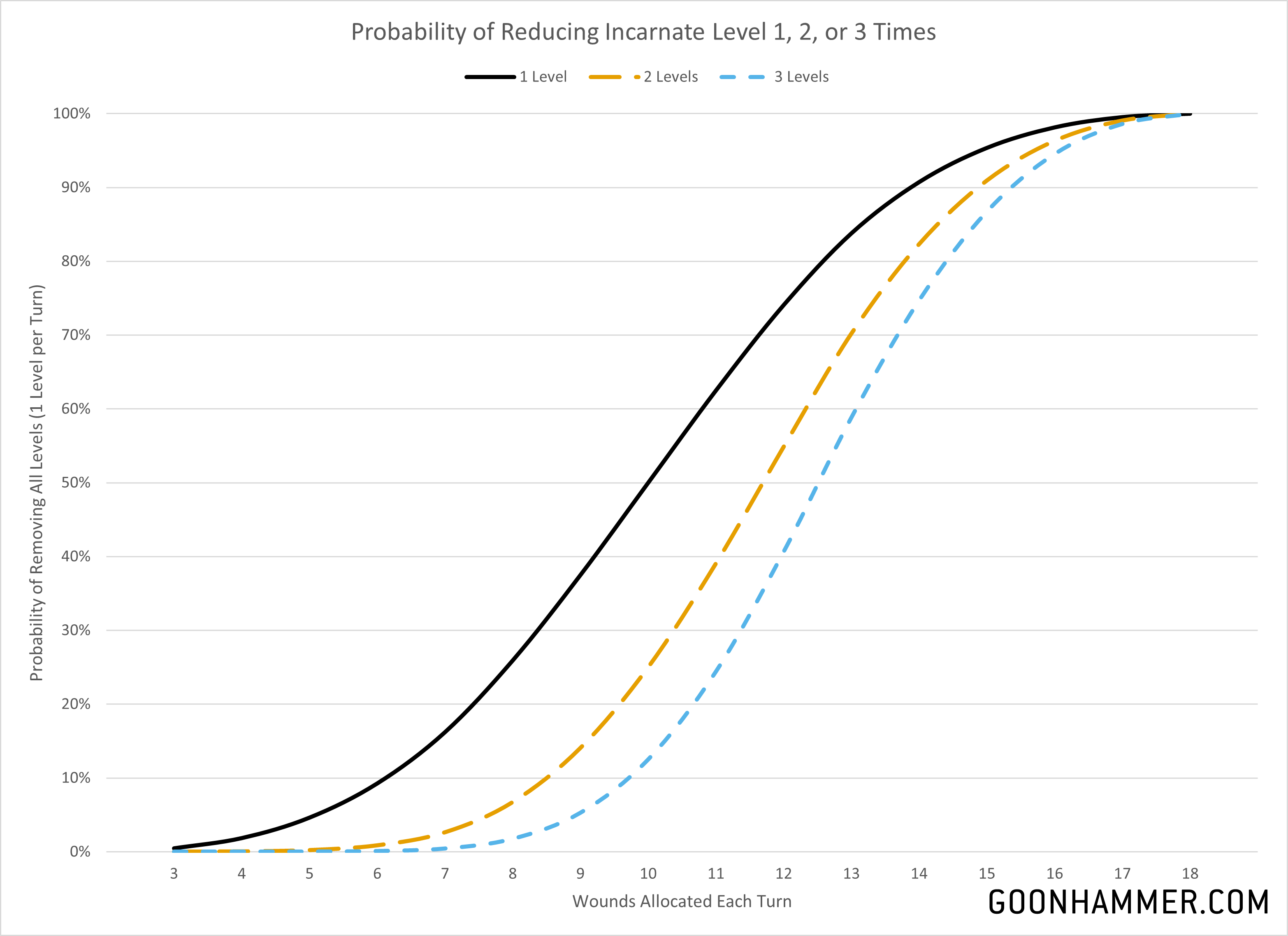 The math around incarnates is fairly interesting, because as so long as the unit has suffered fewer than 18 wounds there's a chance there will be no effect. The raw probability of the target losing a level is simply the chance of rolling equal to or under the target on 3D6, but the requirement that the success occur over multiple phases means you have to consider the cumulative probability of multiple successes. This is accomplished by multiplying the respective probabilities together. For example, if the probability of succeeding once is 50%, then the probability of exceeding twice is 25%. The chart below shows the probability curves to kill an incarnate at state levels of 1 through 3 assuming a given number of wounds is applied each turn. For example, if 10 wounds is applied to an incarnate each turn then you have a 50% chance of reducing it 1 level, 25% chance of reducing it two levels in two turns, and a 13% chance of reducing it three levels in three turns. You can click the image below to expand it.