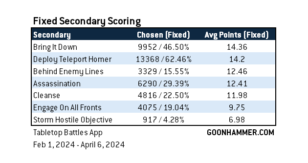 Bring It Down remains the top choice, though is chosen in only 47% of games where Fixed is taken. That makes sense, as for many players the plan for Fixed is "Teleport Homers + Kill Secondary" as a pair of choices, and against factions like Knights or Tyranids the volume of vehicle/monster targets will make Bring It Down a great accompaniment. The average for Bring It Down here is 14.4 VP, suggesting that you should really only be choosing it as a fixed secondary when you think it can net you