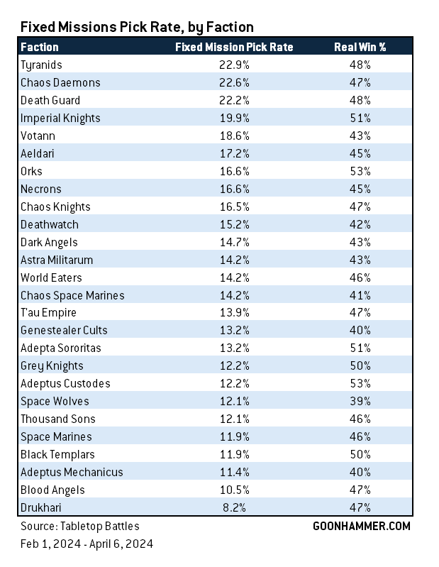 While our data is a bit more limited on the interaction between deployment zone, primary objectives, secondary missions, and faction played, we can make some initial conclusions from the data we've collected on smaller numbers of games.