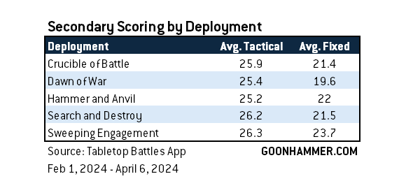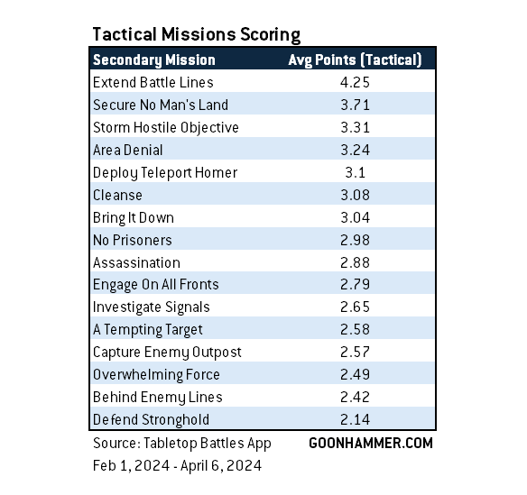 When it comes to Tactical Mission Scoring, more potential points don't always translate to higher average scores - Capture Enemy Outpost awards 8 VP but is only scored in about one-third of games in which it is drawn. On the other side of things, Extend Battle Lines may as well be free. Given the average value of each secondary, players appear to be scoring an average of 7-8 Tactical Secondaries per game.