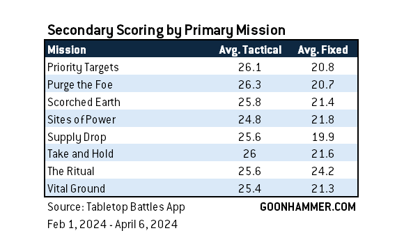 The Ritual is the highest-scoring mission for Fixed Secondaries - in part because this is a mission where the Storm Hostile Objective secondary objective shines. It's a more common and higher-scoring secondary choice on this mission and is a top-scoring pick more often.