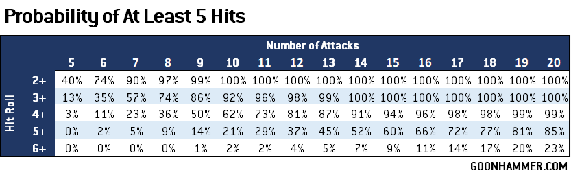 When this Order is applied the attacking unit has the chance to select an enemy INFANTRY unit that is visible. If they do so then they may only target that enemy unit, but if they score 5 or more hits then the enemy unit is suppressed and subtracts 1 from attack rolls. The chart at the top of this section shows the effect of the hit roll modifier, but what is the probability that an attacking unit will get 5 or more hits? For that we can rely on the cumulative binomial probability distribution, which is the probability that there will be at least a given number of successes for a set number of trials. Your standard unit of 10 Guardsmen with a BS of 4+ has a 62% chance of suppressing a target assuming single shots, or a 99% chance when in rapid fire range.
