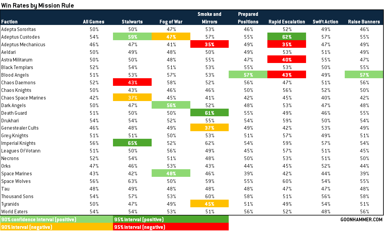 I've gone through and done significance testing for each result in our dataset, comparing the win percentage for each faction with a specific mission rule to its overall win rate (comparing two sample proportions test). Where those results are significant at the 90% and 95% confidence level, I've marked those in the charts below. Because these are two-tailed tests, we're looking for z-scores of 1.96 for 95% and 1.645 for 90%.