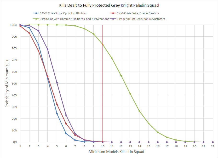 I would like to give a shout out to novembermike for helping me with the Grey Knight numbers, and our good friends at 40KStats for doing what they do. One of the biggest challenges with analyzing the efficacy of units in 40K is quantifying what it takes to kill them. Grey Knight Paladins and T'au Crisis Suits are fun, but it's not exactly relevant to a Tyranid player. In the future I hope to figure out a more universal way of showing what makes a unit vulnerable so that everyone can make use of the data. In the interim I hope this article was educational and entertaining, and I think you for reading.