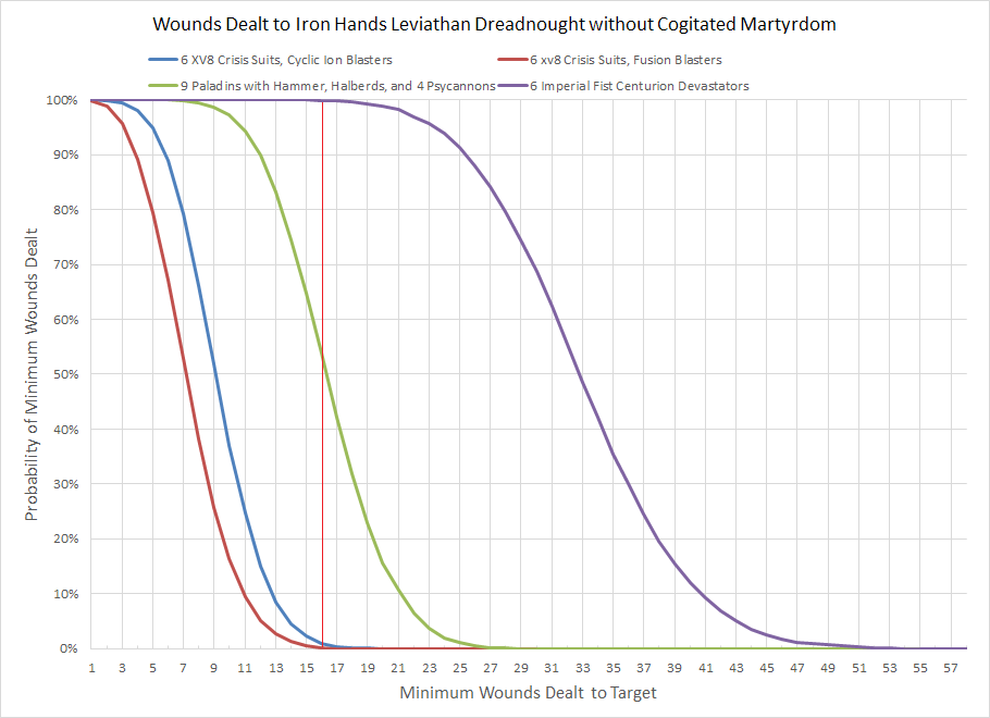 The Leviathan has 14 wounds, meaning the Paladins have a 27% chance of killing it thanks to their assault attacks which ignore Cogitated Martyrdom. The vast quantity of mortal wounds delivered by the Imperial Fists Centurions certainly poses a threat to the Leviathan with a 20% chance of success, but needing to get through the 20 Intercessor wounds (who also typically get a 5+ Feel No Pain) makes that extremely difficult. It should be noted that the presence of the Intercessors is the key source of resilience here; take away those 20 ablative wounds and the Centurions effectively have a 100% chance to delete the Leviathan. This can be seen in the chart below, where Cogitated Martyrdom is removed.