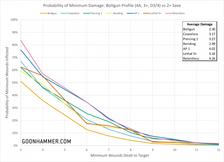 AP 1 in second place thanks to the ability to reduce the Defense dice by 33%. As with the 5+ save chart any special ability provides a significant improvement in average damage, adding at least 30% more damage compared to the standard bolter profile.